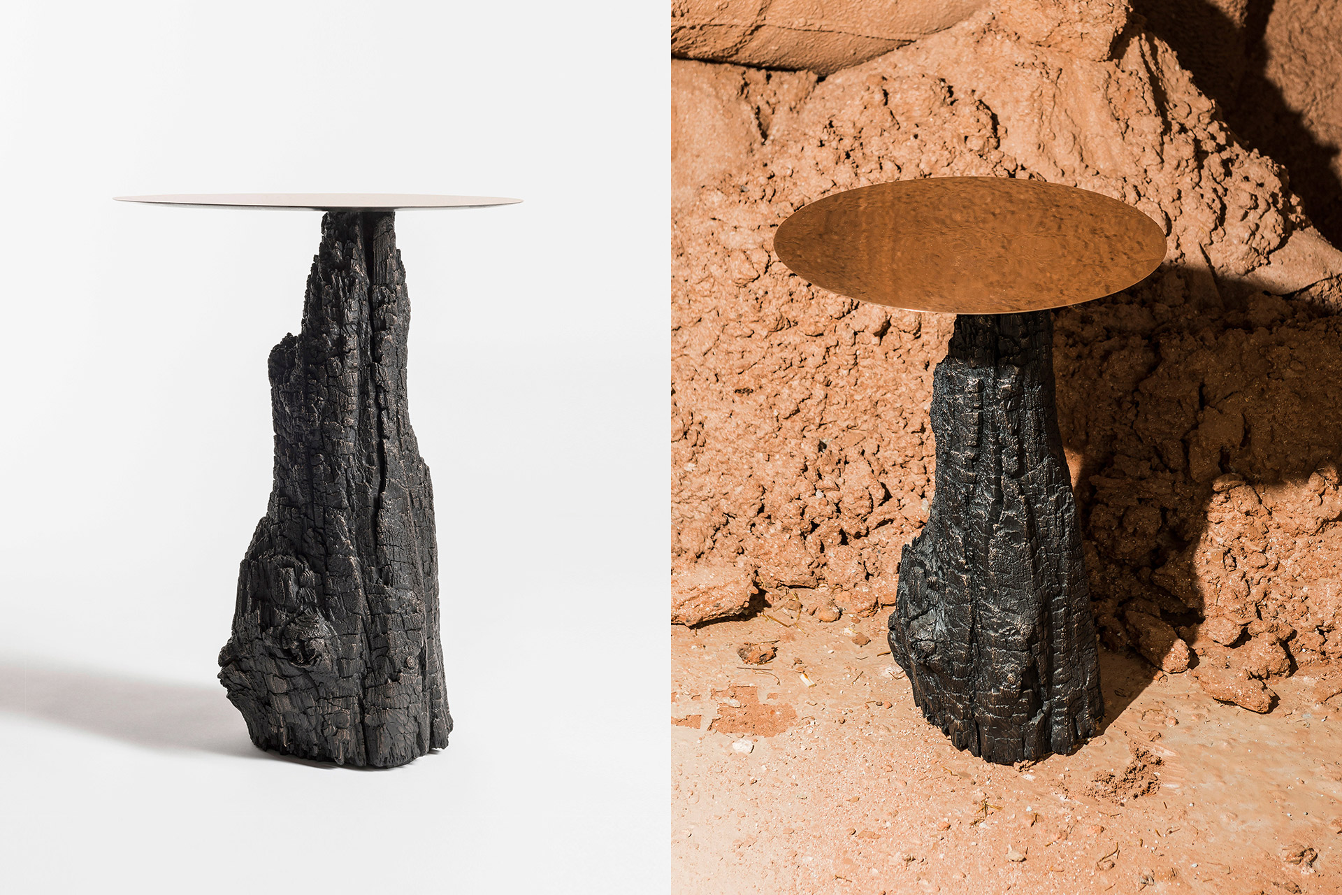 FUOCO side table takes shape from the collection of the remains of a cedar trunk burned in a natural fire in the forests of the Lombardy Alps, coordinates 46° 18' 50", 10° 15' 59".